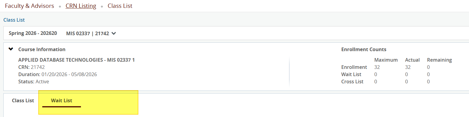 After selecting the CRN, select the 'Wait List' tab next to the 'Class List' tab as shown below.