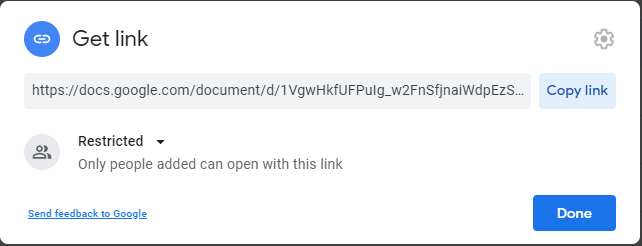 4. Link sharing will now be on. The link will automatically be highlighted. Click "Copy link" then select "Done".