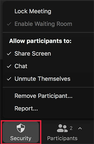 In Zoom, hosts will see the meeting Security icon. Clicking the icon shows many useful options in a single menu.