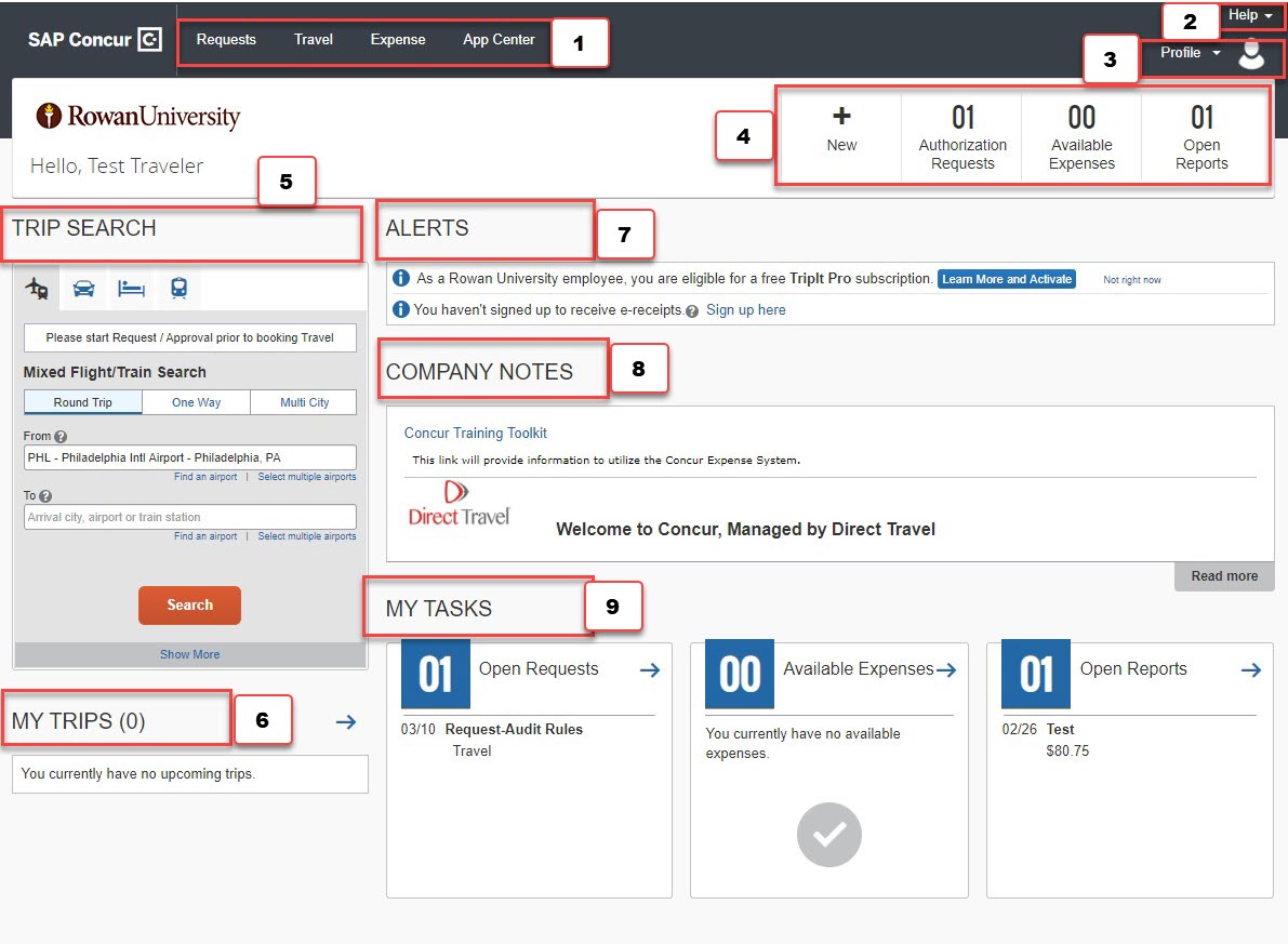 - Profile – Add approvers, verify personal information for travel purposes, set up preferences, designate delegates, etc.