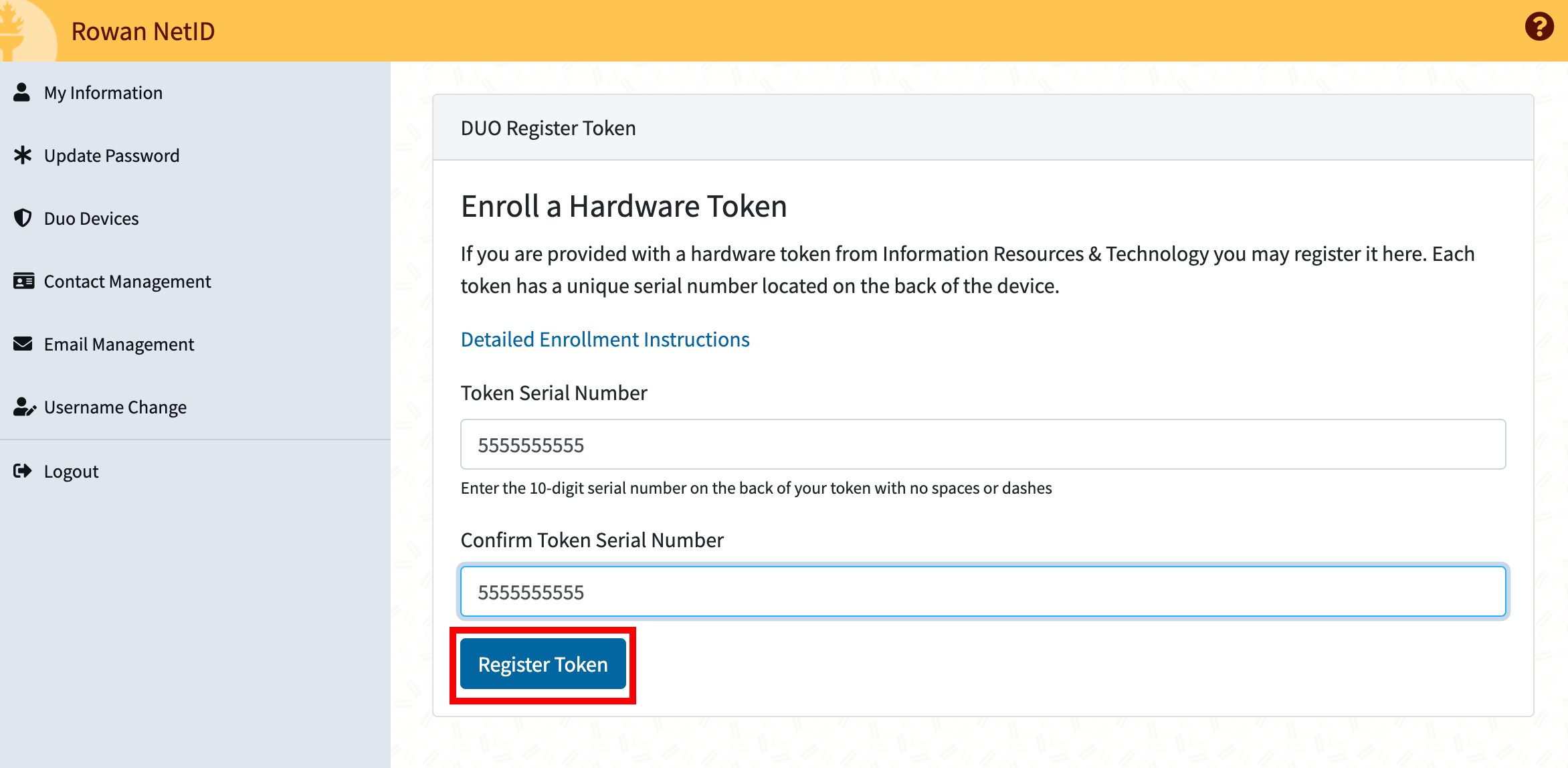 4. Enter and confirm the 10-digit serial number on the back of your token and click Register Token.