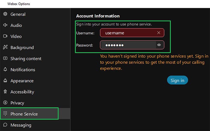 - Select Phone Service from the Webex Options window. The menu is on the left side in Windows and across the top in macOS. (If you do not see the Phone Service option, sign out of Webex and sign back in (see step 1).)