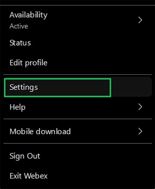 - Select your initials at the top left corner of the Webex App.
