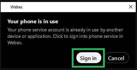 NOTE: If you are currently using phone services in Webex on another device you will get an error message. Select Sign in to transfer your phone service to Webex.