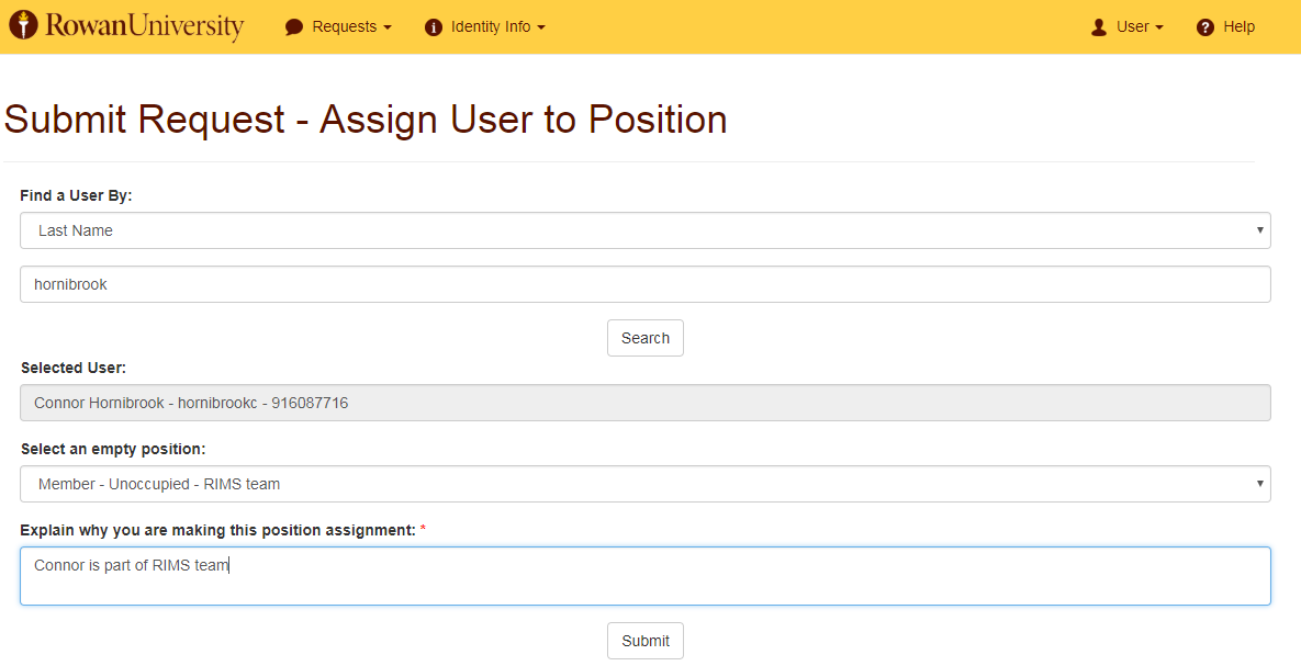 7. Find the member you want to add by last name, Banner ID or email address, verify the details and select the user. Choose an empty position and click Submit