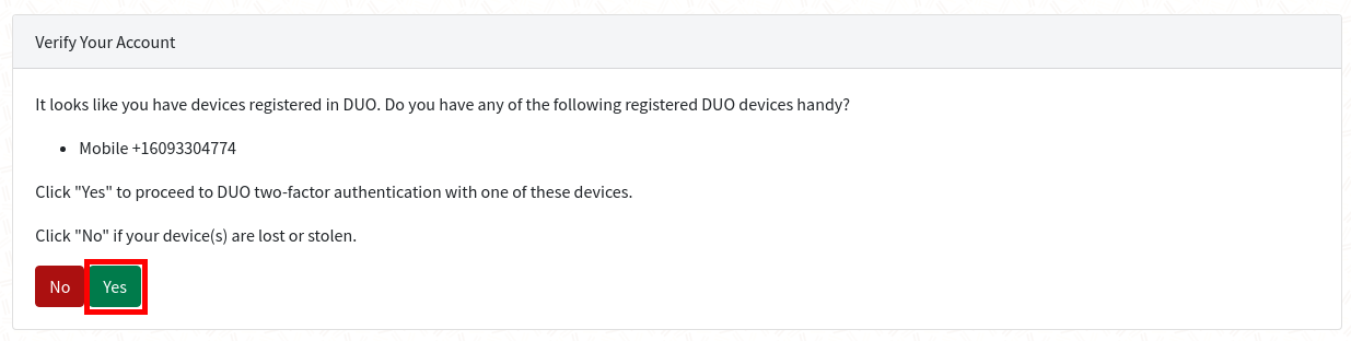 11. You will now be prompted to verify your identity with Duo two-factor authentication with the device you enrolled in the previous steps. Click Yes.