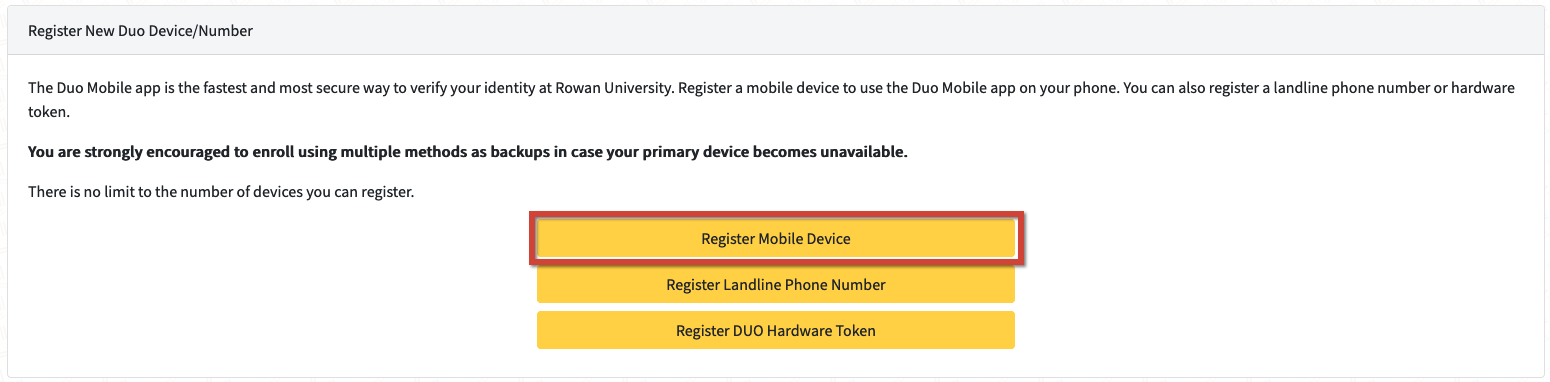 4. You will be prompted to enroll in Duo two-factor authentication. Click Register Mobile Device