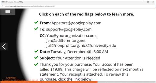 Please use a laptop or desktop with Internet Explorer 11 or higher, Microsoft Edge, Chrome, Firefox or Safari for the KnowBe4 training courses. It is not recommended to use an iPad, tablet or mobile device to complete this training.