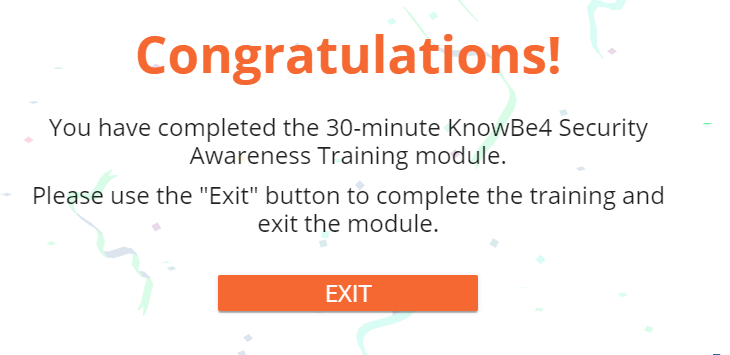 You must click Exit on the "Congratulations!" screen for training to be marked as complete. To finalize your training, log back into go.rowan.edu/securitytraining and click Resume.