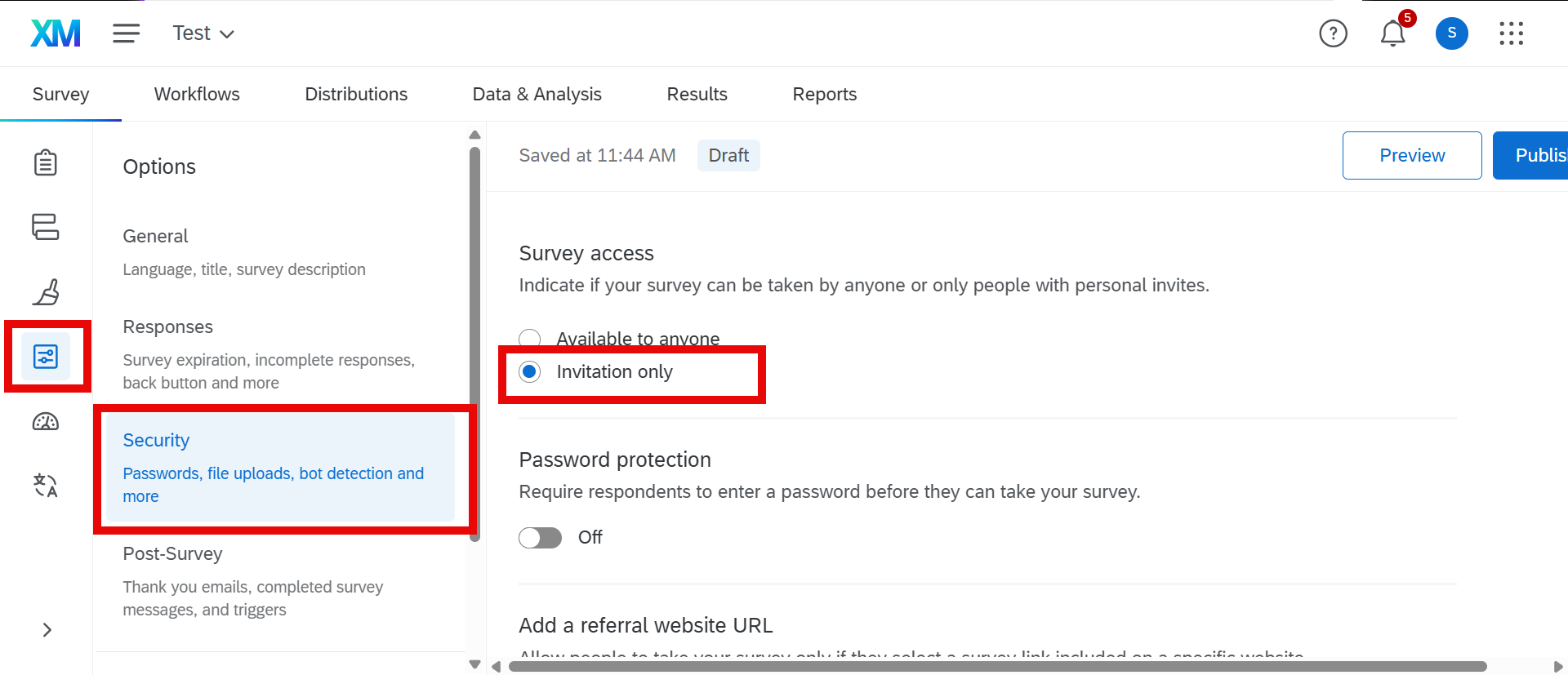 When managing a respondent’s access to a survey, you can set up secure access by invitation only instead of making the survey available to anyone. If you set up your project for invitation only, respondents are sent a personal link or invited via email to access the survey. This adds an extra level of security so that no one can enter the survey using the anonymous link or submit multiple responses.