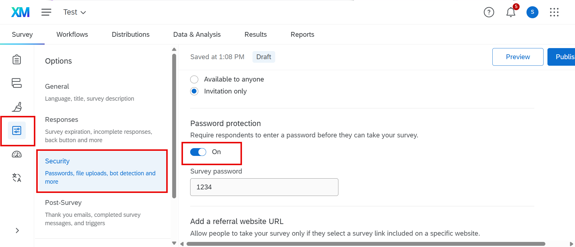 - Go to Survey>SurveyOptions>Security>PasswordProtection>On