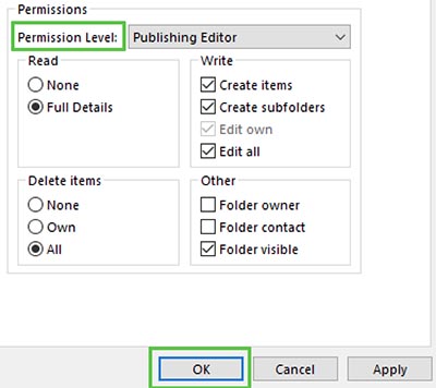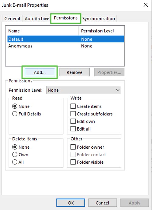 Before email folders/mailboxes can be shared with other users in Outlook, you must set up the account's default folder permissions. If this step is not performed before sharing, the folders will remain inaccessible to those users.