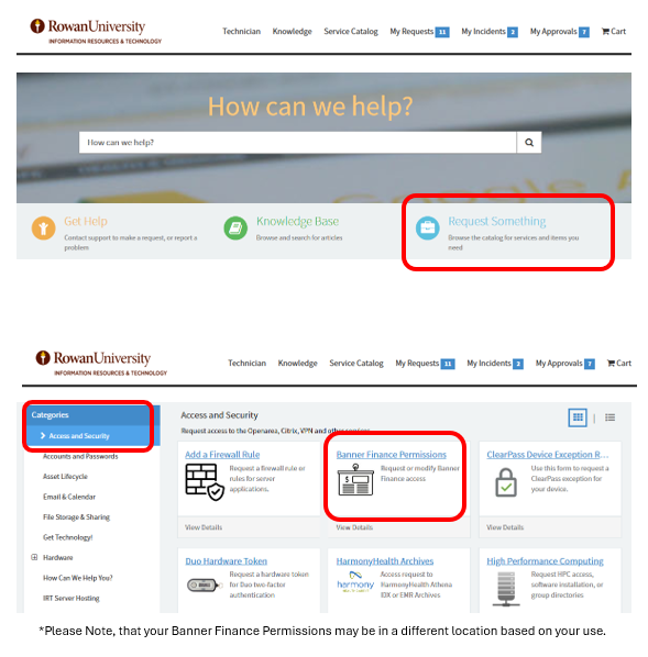 Requests for Banner Finance Security access are made through Rowan Support Portal under the Request Something section, within the Access & Security category. Access to Banner systems is restricted to those employees requiring access in order to enable them to fulfill their job responsibilities. All requests for access must be approved by the appropriate Supervisor (Manager, Department Head, Faculty member or Principal Investigator (Grants).