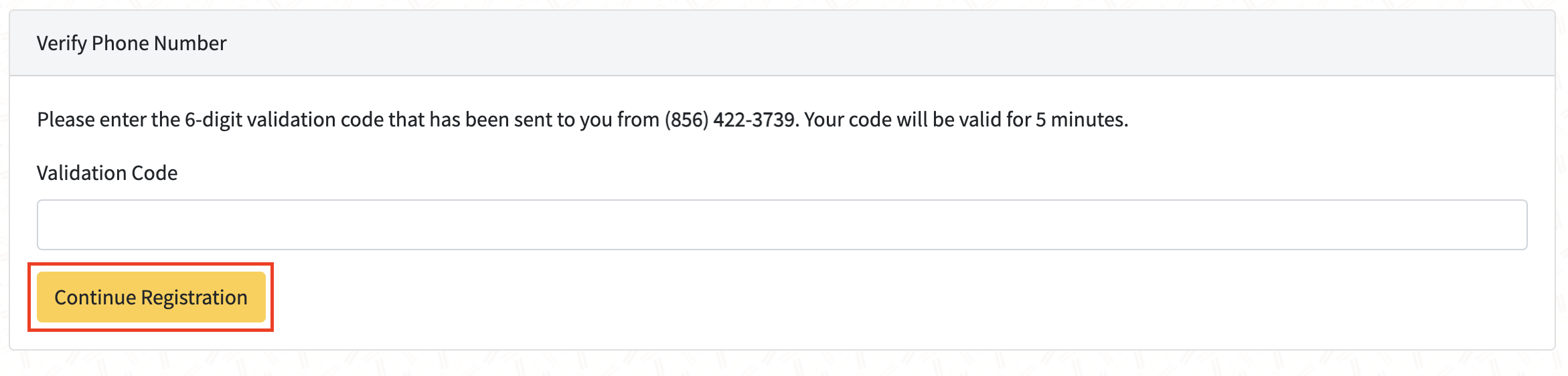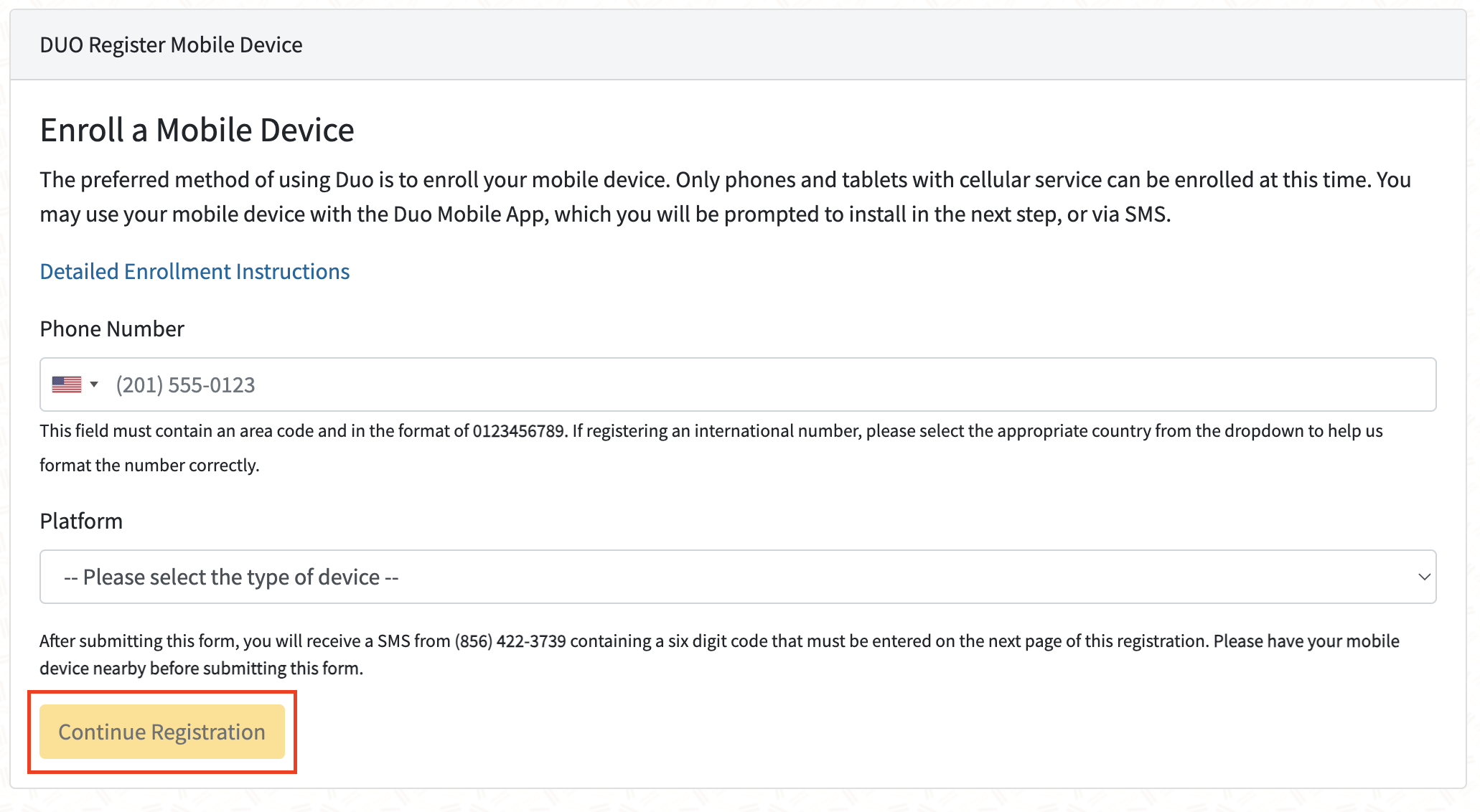 - Enter your phone number, select your device platform, and click Continue Registration.