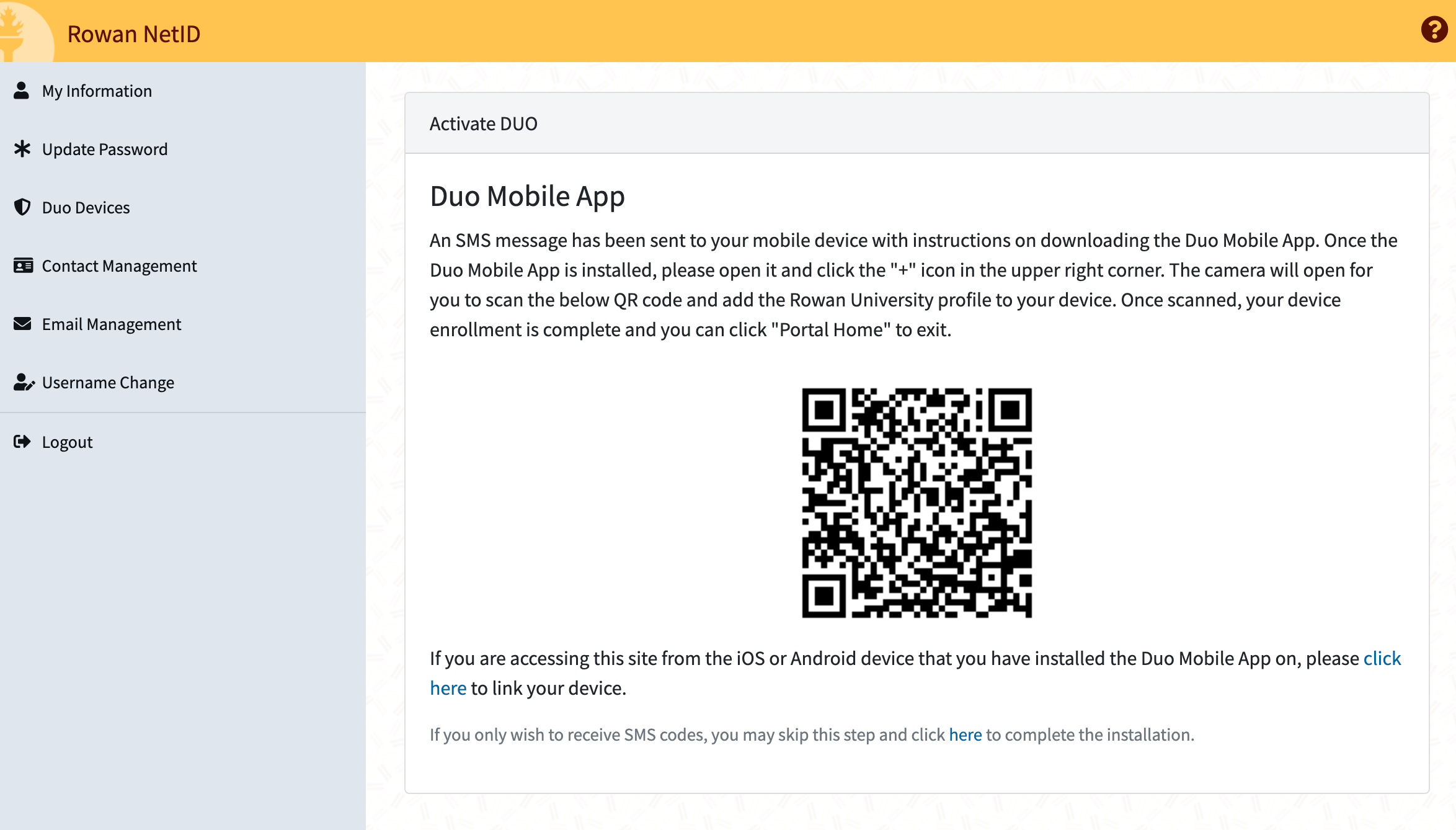 - You'll receive a text message with a link to install the Duo Mobile app. Download the app, and follow the instructions until you are prompted to install the QR code. Once scanned, your device enrollment is complete.