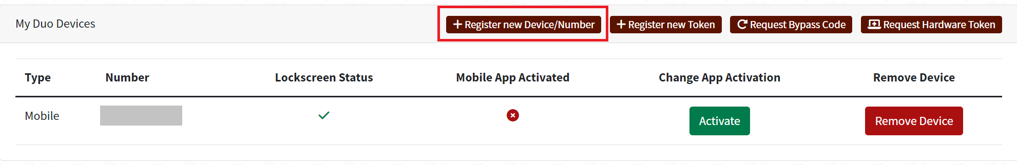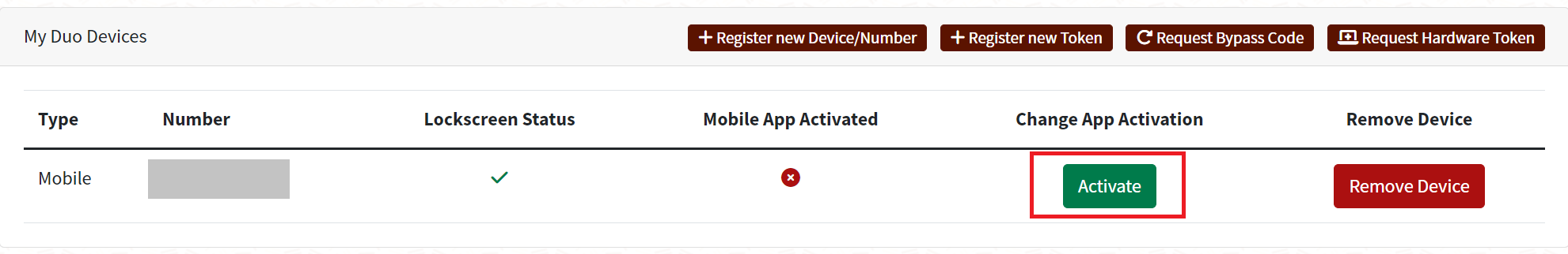 - Under "Change App Activation" click the "Activate" button to start the Duo Mobile app registration process