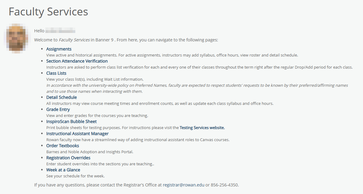 With the implementation of the new Faculty Grade Entry module in Self-Service Banner, a new Faculty Services dashboard has been introduced, as shown below. It includes links to frequently used faculty features, such as class lists, attendance verification, and final grade entry.