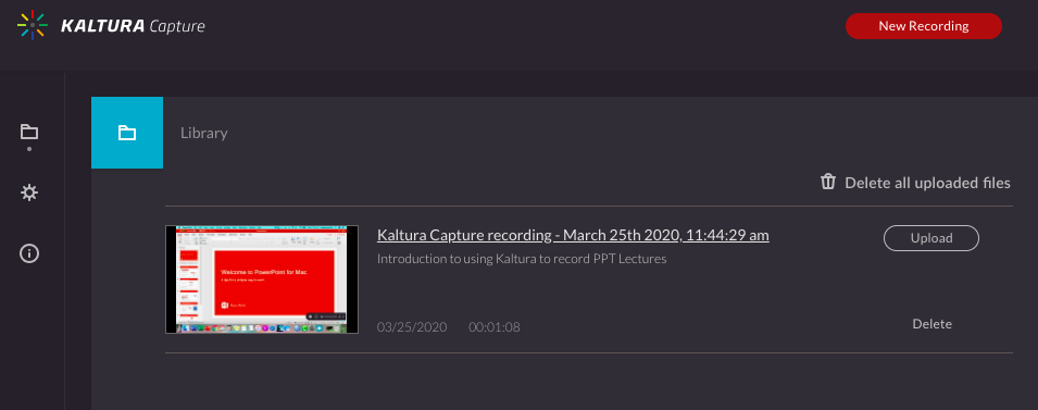 - You will now be presented with the KalturaCapture application recording widget or a recording library window if KalturaCapture is already open. (Click the red ‘New Recording’ button in the top right corner of the window if the recording library is open)