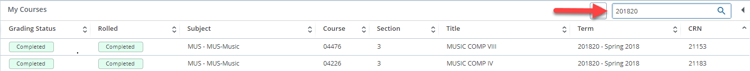 The new Faculty Grade Entry Banner 9 module will list all faculty members' sections, not just the current ones.  However, the faculty members can search for the specific sections they want to grade by entering either the CRN, Course Title, Course Number, or Term Code.  For example, if a faculty member only wants to view sections taught in the spring 2018 term, they would search by the Term Code “201820”.  This will filter out any other sections and only list the spring 2018 sections.