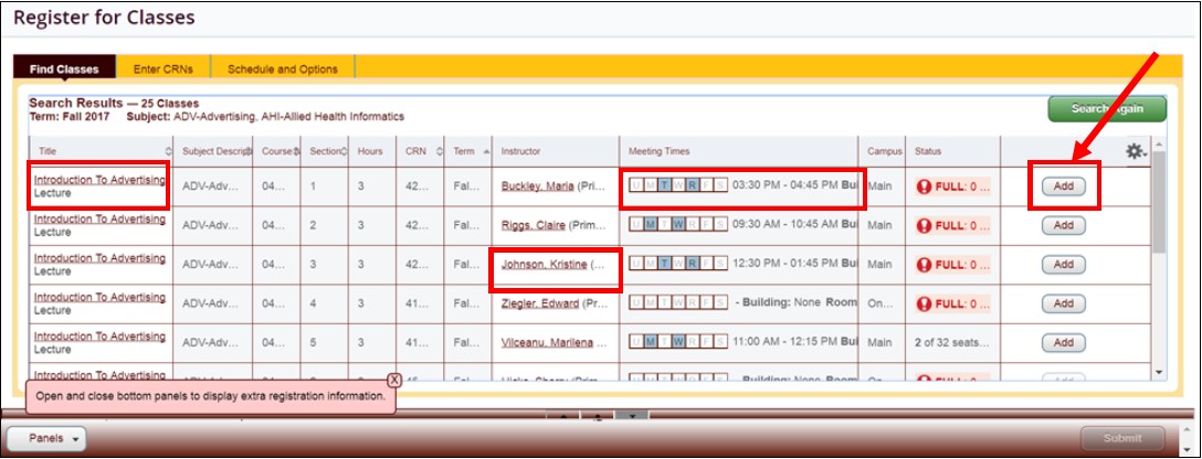 - You can click on underlined results to see more detail about classes and instructors. Notice the days of week of the classes are in blue - hover over for specifics. Select the Add button to add the class to your schedule.