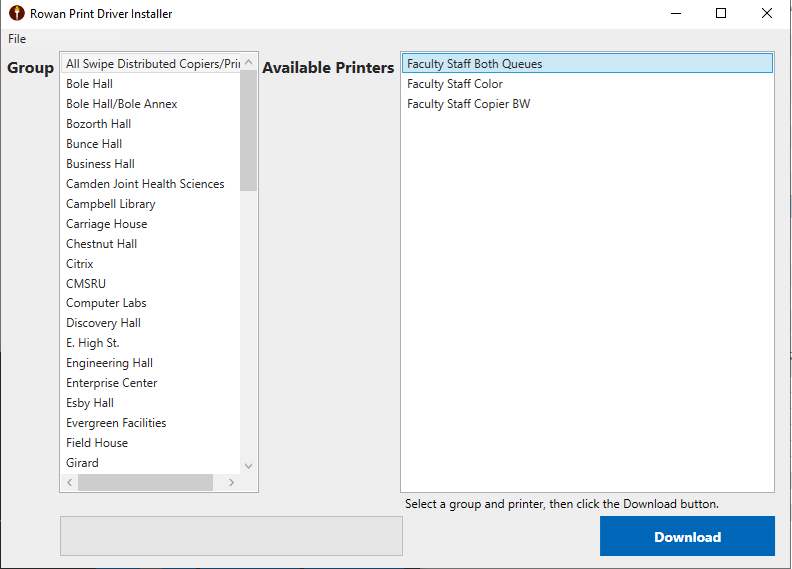 - To install a local network printer, locate your building in the "Group" column. Then locate the printer you want to add in the "Available Printers" column. Select the printer you want to install and click Download. To install a Distributed Copier/Printer (That has a ID Card Swipe/Touch reader), select All Swipe Distributed Copiers/Printers as the "Group" and Faculty Staff Both Queues as the "Available Printers."