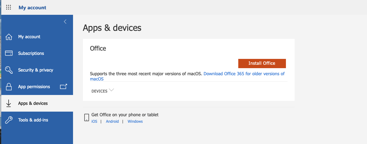 - After logging in, you'll be brought to the Apps & devices page of the Office 365 portal. Click Install Office to download the Office installer.