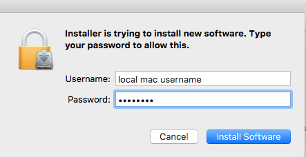 - The installer will prompt for the local Mac account you use to sign in to your machine. Type the password for the account and hit Install Software.