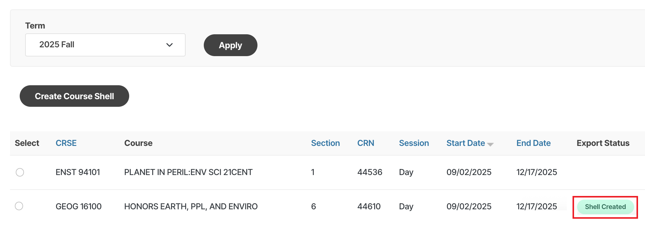 The list of courses for the selected term will appear. The Shell Created label indicates that the course shell is already created. - Select the radio button next to the course you want to create the Canvas course shell for, then click the Create Course Shell button.