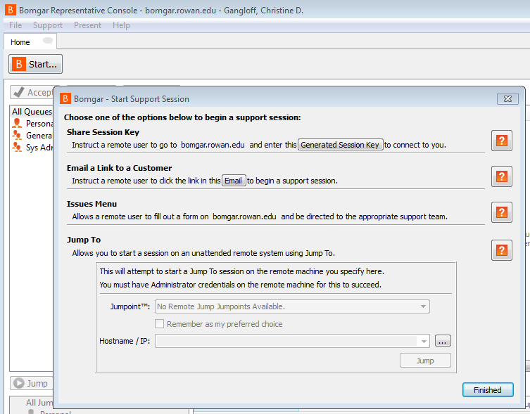 Once installed, you can direct customers to http://remote.rowan.edu to initiate a session, or send them an email link from within the Representative Console.