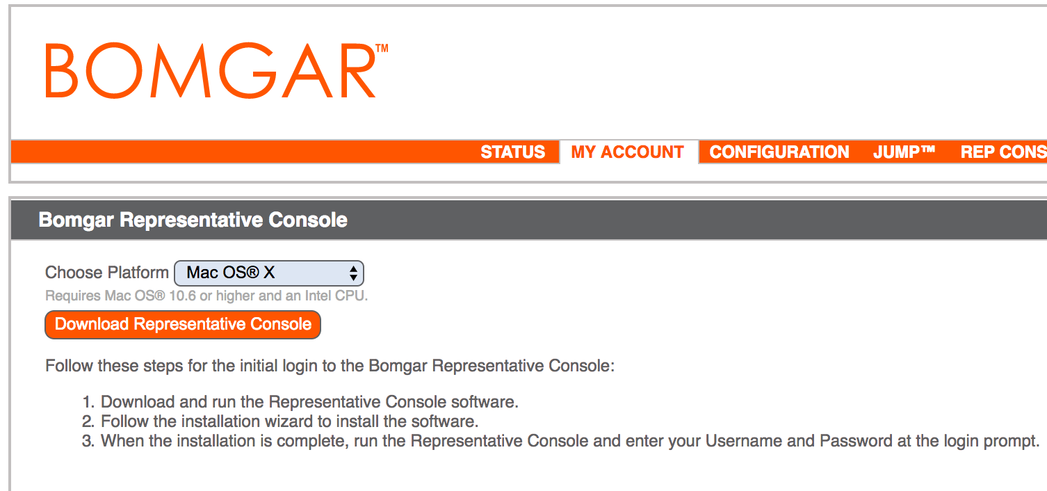 Once logged in, you can download the Bomgar Representative Console from the MY ACCOUNT tab.