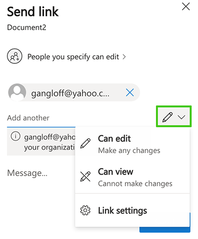 Click the down-arrow next to the "Edit" pencil icon and choose the level of access the guest should have. Enter a message if you'd like and then click Send to email the invitation.