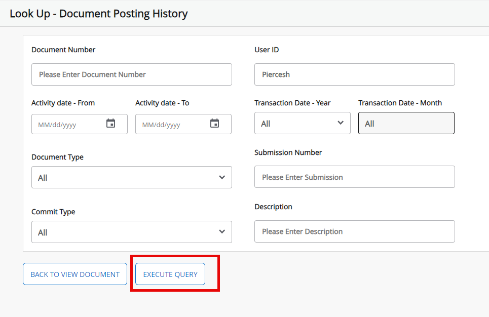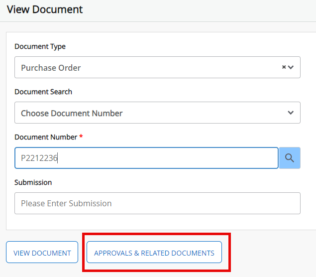 Note: You can copy the document number, update the document type, and paste the document number under Document Number. Select View Document or Approval & Related Documents to view more results.