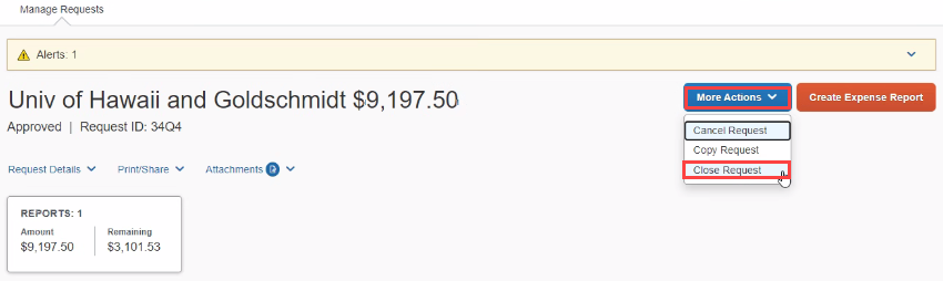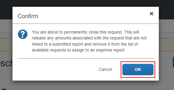 - Important Note: Do not close a Request that has yet to be expensed. If you close a Request that is associated to an unsubmitted Expense Report, the Request will be disassociated from the Expense Report, the authorized amounts will be removed, and the Request balance will be reduced to zero.