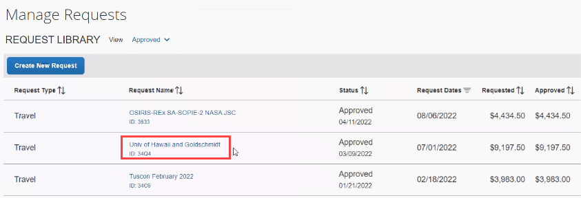 3. Select the name of the Request