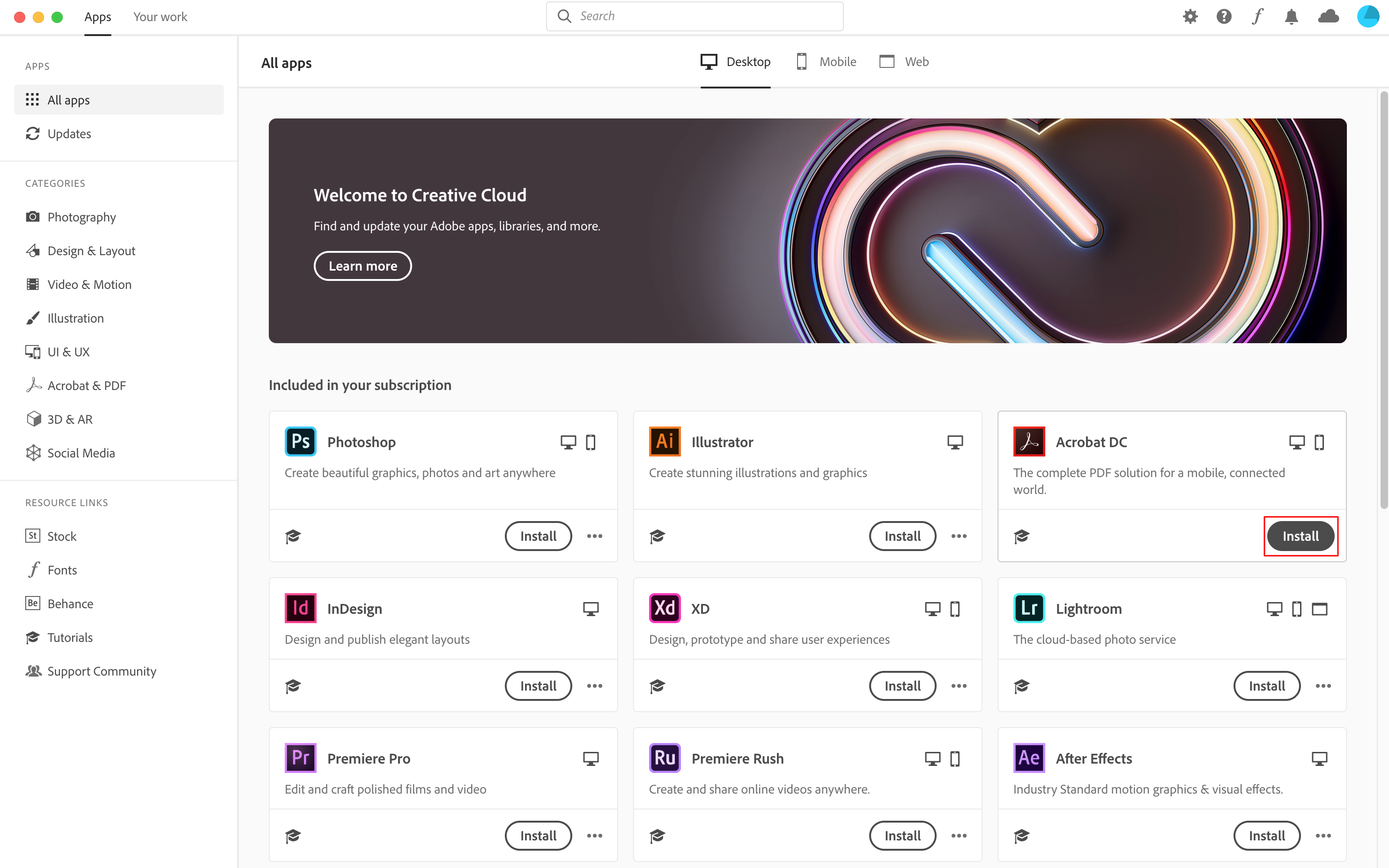 4. Find the Creative Cloud Desktop Application installer and click Install