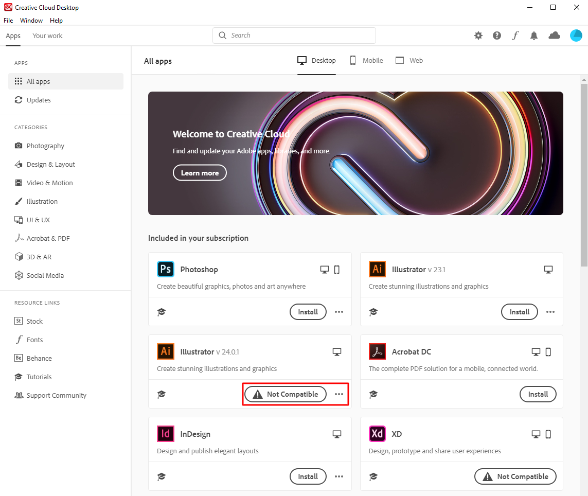For more information on how to download or install apps, see Download and Install Creative Cloud apps.