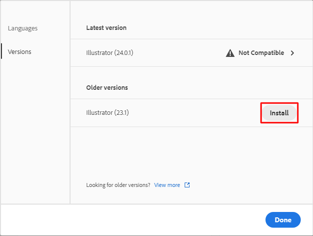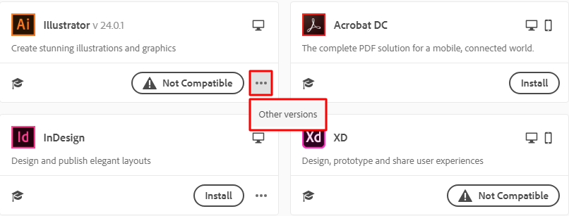 11. Click the three dots just to the right of the Not Compatible button and select Other Versions