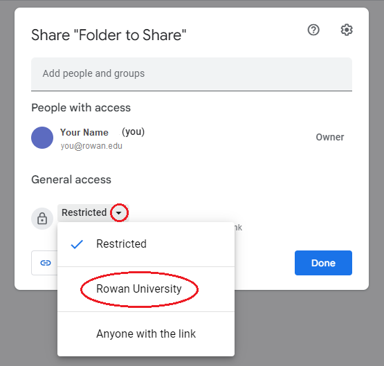 - In the dialog box, make sure that General access is set to Rowan University.