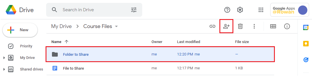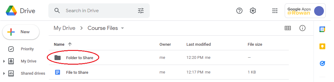 - From your Rowan Google Drive, select the file or folder that you want to share by clicking on it.