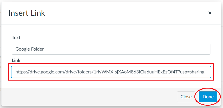 - A new dialog box will appear. Paste the link you copied from Google Drive into the Link field and click the Done button.