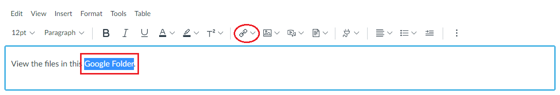 - In your Canvas course, select the text you want to put the link in, and then click the Link button.